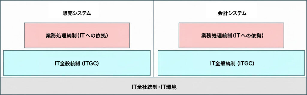 • IT全社統制:ITガバナンス、方針・責任体制、IT戦略など、企業全体のIT管理に関する統制